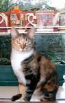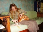 Well, this has been the easiest integration of new beasts we have ever had. We were prepared to have issues with Maggie, the cat Freya rescued July 4, 2004, since she is fairly antisocial and quite the hunter. For the record, Satin angoras are the size of an average cat and aren’t in any real danger from them. Maggie is a smaller than average cat and is rather smaller than any of these buns. However, she has appointed herself Bunny-nanny and now spends most of her day on the dryer watching them. I heard a commotion and ran to the kitchen door, just in time to see Rob scooting up the stairs with Maggie in hot pursuit. I guess I left the laundry room door open and he sneaked down to peek at them.