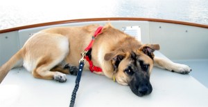 I was inside wiping out the various holds when I heard a voice say, “There is a dog in trouble here!” I looked out and saw a crowd of people on the boardwalk above us and I ran to the end dock-spur. He was in the water, caught between a small sailboat and the dock and penned in from the sides by her boat fenders. He was clinging to the dock and struggling hard but couldn’t pull himself out. I was able to reach in and grab him by the handle on his jacket and drag him up to Scott while the onlookers applauded.