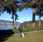 We just spent a perfect weekend in Vancouver BC and we are so ready to become Canadian! Scott used the Dogfriendly website to locate a hotel that would accommodate Robert and got us a room with kitchenette, complete with a dog bed and bowls at the Vancouver Best Western Downtown. We had been keeping track of weather reports and were expecting snow but the weather was perfect, sunny and bright. We walked all over downtown Vancouver and through beautiful Stanley Park where we saw the totem poles, coastline, and teahouse. We were each able to indulge our tastes — Scott found a dog friendly cigar store where he and Rob spent an afternoon and he will soon have a blogpost up about that while I found the treadmill and jacuzzi at the hotel’s fitness center and spent my “leisure time” there. Rob had a blast just being a hotel-dog meeting new fans, riding the elevators, climbing stairs and going for lots of urban walks.