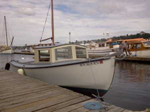 Scott has our Chinook, the boat, not the dog, up at the Center for Wooden Boat’s weekend boat show. She looks great with all the other wooden boats and it is a fun crowd. There are some classic Lake Union Dreamboats. The weather has been great (fingers crossed) and the little kids are all attracted to our boat. If you are in Seattle make sure to stop by and see her. We’ll be there periodically and a friend will be showing her the rest of the time.