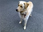 Meet Marley! I met her this morning on my walk. I was thoroughly enjoying the cool morning mist and trying out my new poles for the first time (I’ll fill you in on those later) when I saw a golden lab-type dog in the road. She was standing in the middle of the street in a residential area right off the main-drag. When she saw me she started limping toward me. I turned my head, shifted my poles to a one-handed carry and walked in a slight curve, doing all those things you are supposed to do to communicate friendliness to a dog. She came close but didn’t like the poles in my hand. Once I put them down I was able to pet her shoulder and get a look at her tag. It said Marley and had a phone number. I asked “Are you Marley?” in my best high, squeeky voice, and she frisked around me in a circle with her butt tucked under like Rob does… no more limp.