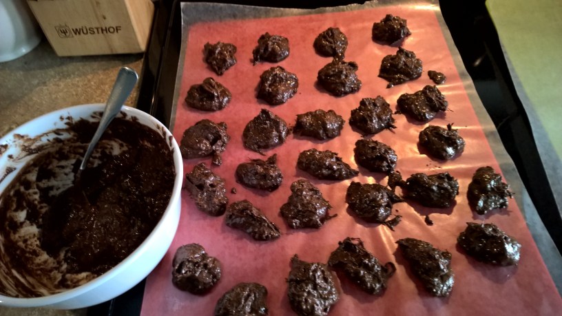 Ecco doggy bark. Yes, I know, it’s not particularly appetizing looking, but the dogs love it. I made this batch with sweetened carob chips because I couldn’t find unsweetened. I made sure to check that they didn’t contain xylitol which is ok for humans but toxic for dogs, according to VetMedicine. This is a forgiving recipe, we had some extra peanut butter so I added more than 1/2 cup, it still worked. If the mixture gets difficult to stir, put it back in the microwave for another 30 seconds. Robert and Gracie haven’t had any yet because they have to wait while theirs chill but I have. 🙂