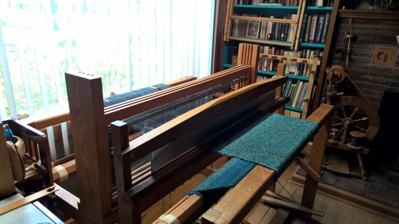 I finished all the earth-toned warps and still in keeping with using up stashed yarns, went shopping in the bins in the laundry room for both of these projects. On the Flip, we have a wide scarf in “Shawl in a ball” in Healing Teal, and on the big Jack, a rug from black carpet warp with Lion Brand Homespun Thick & Quick in the Lakeside Stripes colorway. It looks like the water in one of Monet’s water lilies paintings. As much as I love the look of the earthy, “Imagine” warp, I don’t know if I’ll do that again. It was a tough project to weave.